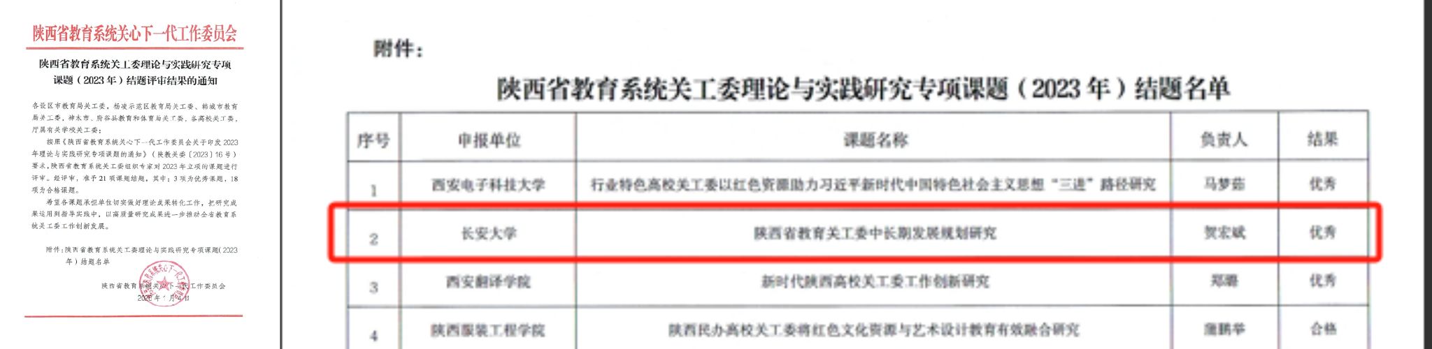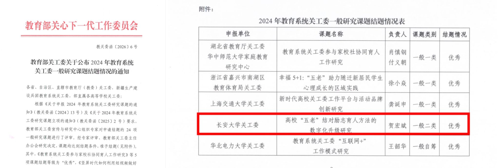 3月27日,教育部关工委印发教关委函〔2026〕6 号文件,公布了2024年教育系统关工委课题结题情况。长安大学关工委申报,贺宏斌教授负责的《高校“五老” 结对励志育人方法的数字化升级研究》课题获评优秀等次。