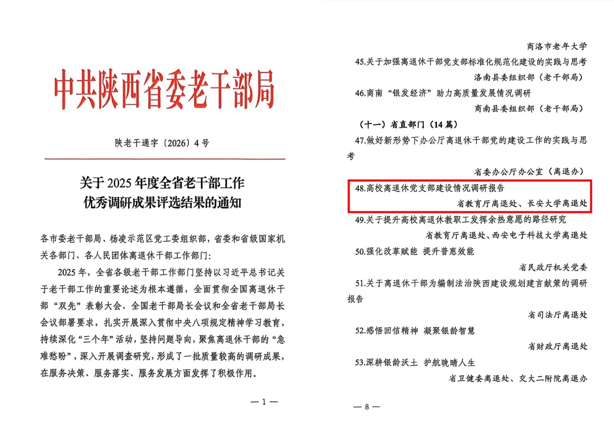 近日,中共陕西省委老干部局印发《关于 2025 年度全省老干部工作优秀调研成果评选结果的通知》(陕老干通字〔2026〕4 号),长安大学离退休处党总支牵头组织完成的《高校离退休党支部建设情况调研报告》获评 2025 年度全省老干部工作优秀调研成果,这是对学校离退休党建研究与实践工作的充分肯定。